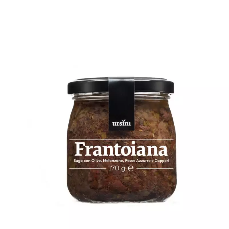 Urs ini’s Frantoiana sauce is based on the ancient recipe for Frantoiana (or Trappetara), a first course that was often eaten inside oil mills, to feed the workers at work, during the olive harvest period. The main ingredients are pitted nostrano olives and extra virgin olive oil, then poached red garlic, purple aubergines and nostrano red radicchio are added. Ursini has further embellished the recipe by adding sweet dried peppers, small capers and blue fish. Try it with short pasta shapes such as paccheri and penne.