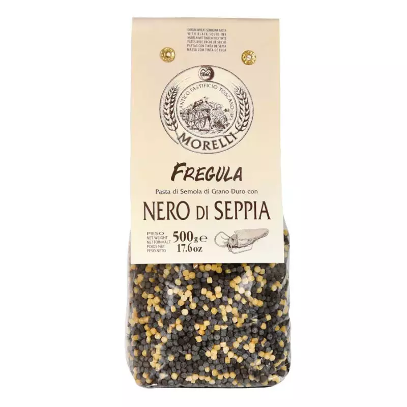 Durum wheat Fregula with squid ink from Pastificio Morelli is a reinterpretation of the traditional Sardinian pasta made of small, irregularly sized pasta balls, slightly larger than couscous. Not only is it delicious, it is also aesthetically appealing thanks to its two-tone black and white colour scheme. Thanks to its porosity, this pasta is extremely versatile and goes well with full-bodied sauces and condiments. It is also ideal to be cooked as a risotto and topped with fish or seafood sauces.