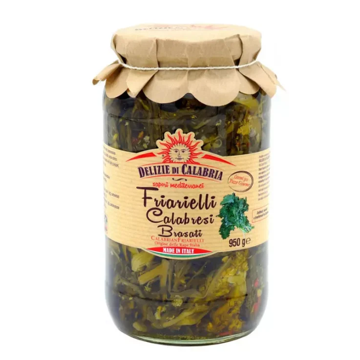 Calabrian Friarielli Brasati by Delizie di Calabria in a 950 g maxi format are a delicious reinterpretation of the classic Neapolitan friarielli. These friarielli, braised and enriched with a pinch of sweet chilli pepper, offer an even richer and more inviting flavour, perfect for those who love vegetables with character. The raw material is strictly grown, harvested and processed in Calabria, guaranteeing a product of the highest quality that brings all the authenticity of Calabrian tradition to the table. Try them accompanied by sausage, as tradition dictates, for a typical and irresistible dish. Friarielli Calabresi Brasati are also ideal for preparing excellent gourmet pizzas, adding a unique and unmistakable touch of flavour.
