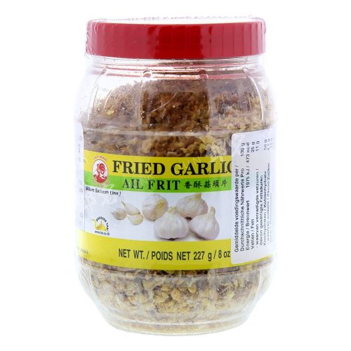 Fragrant fried garlic. Use to flavour dishes like stir-fried vegetables, rice, noodle and noodle soup.