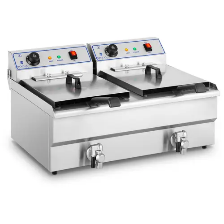 Avec cette friteuse double bac de Royal Catering, votre établissement est parfaitement équipé. Avec une capacité de 2 x 16 l et une puissance de 6000 W chacun, vous pouvez utiliser cet appareil de manière professionnelle dans les restaurants, les snacks ou les food trucks. Cette friteuse électrique en acier inoxydable de haute qualité résiste à la rouille, a une très longue durée de vie et convient très bien à la manipulation des aliments comme il n’altère pas le goût. De plus, les surfaces lisses sont particulièrement faciles à nettoyer.