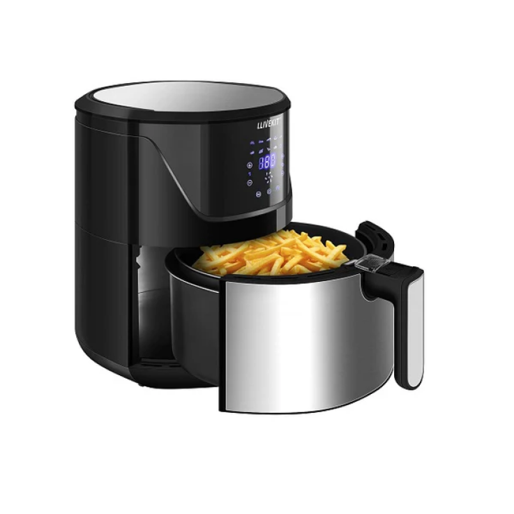 Vous préconisez de manger sainement ? Vous avez besoin d’une friteuse sans huile ! Remplacant l’huile par l’air, cet air fryer profite de la technologie de circulation d’air chaud à 360° à grande vitesse pour cuire rapidement des aliments et les faire croustiller. Pas besoin d’huile, des plats sains seront prêts en un clin d’œil ! Pendant le travail de cet appareil de cuisson, vous ne sentirez pas de fumée.Vous voulez cuisiner facilement ? Voilà notre friteuse à air intelligente avec écran tactile ! Cette friteuse électrique est équipée d’un écran tactile LED sur lequel vous pouvez régler la durée (0-60 min), la température (80-200 °C) ou sélectionner la fonction de conservation de la chaleur (0-2h). De plus, cette friteuse à air chaud dispose de 10 programmes prédéfinis, vous pouvez choisir l’un de ces modes de cuisson d’après des ingrédients préparés.Vous avez une famille nombreuse ? Vous avez besoin d’une friteuse de grande capacité ! Cette friteuse à air pulsé de capacité de 5L offre une grande contenance de cuisson. À une puissance de 1400 W, cette friteuse électrique peut satisfaire à un grand repas en famille ou avec vos amis. Selon le livre de recettes exquis fournis, vous pouvez facilement préparer des frites, des ailes de poulet, des pizzas, des steaks, des gâteaux, du pain, etc.Vous faites attention à la sécurité ? La friteuse fiable sera votre choix ! La friteuse à air gourmet est faite d’une coque en PP résistant à haute température. Elle dispose d’un filet de protection pour l’anneau chauffant, d’une poignée anti-brûlure, d’un coussin de protection contre le mur, des coussinets antidérapants et d’un système de protectioncontre la surchauffe, vous pouvez donc l’utiliser en toute confiance