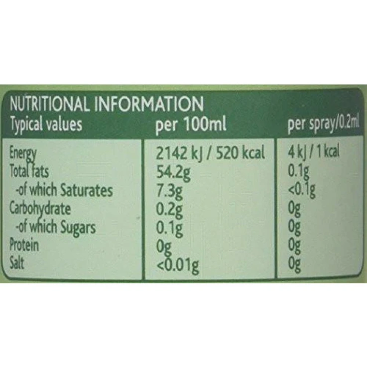 Extra virgin olive oil & soya lecithin emulsion non-stick cooking spray, for shallow frying, roasting and baking. – The only 1 Cal spray – Low fat cooking – No cholesterol – Less than 1cal per spray – Non-stick. Economical With less than one calorie per spray, FryLight® helps you fry and cook the healthier way, without conventional oil or fat. FryLight® gives you all the taste of Extra Virgin Olive Oil at the touch of a button. Spraying with FryLight® also prevents food from sticking. Each 1 Cal spray of FryLight® replaces up to 30 Cals from conventional oil in shallow frying and roasting. Use in all frying, baking and roasting. FryLight® Extra Virgin Olive Oil is ideal for preparing Mediterranean dishes & prevents cooked pasta & spaghetti from sticking. No artificial preservatives or propellant gas. Will only help slimming or weight control as part of calorie controlled diet. The only 1 cal spray, For frying, roasting and baking, Gluten Free, Vegetarian Society approved, Suitable for vegans