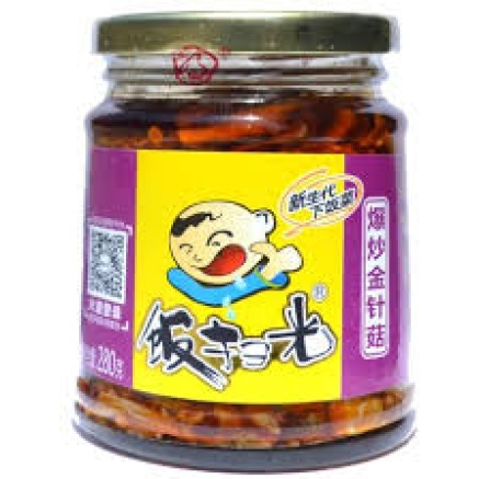 Ingredients: enokitake mushroom (26%), soybean oil, chilli, preserved mustard, stem lettuce, ginger, garlic, salt, yeast extract, sugar, spices, flavour enhancer (E621). Contains allergens: mustard.