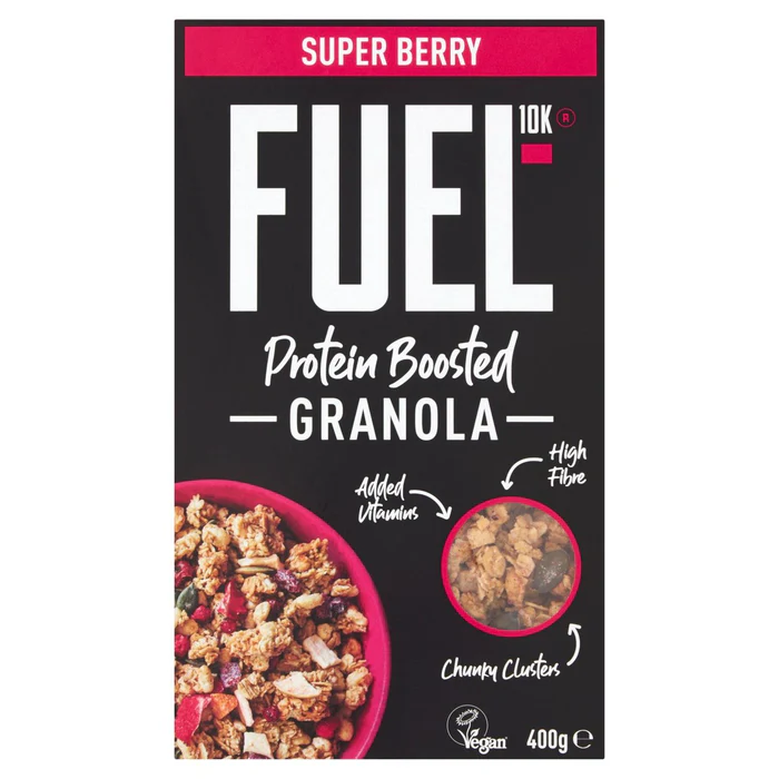 Say goodbye to boring breakfasts. Our protein boosted granola is a delicious way to power you through the morning. Chunky clusters of oven-toasted jumbo oats, loaded with pieces of real fruit, from apples to peaches, cranberries to blackberries, strawberries and more. Eat with yoghurt. Eat with milk. Eat in handfuls by the box. Fuel your journey, Protein boosted, High fibre, Added vitamin, Registered with the Vegan Society, Suitable for vegetarian & vegan diet.