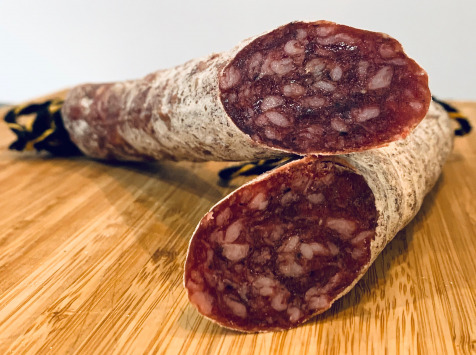 Le résultat ? Un saucisson nature, peu salé, très doux, avec une pointe subtile de poivre pour le côté “‘électrifiant” ! Un produit naturel, sain !