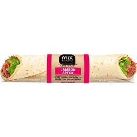 Galette de blé garnie de poivrons rouges, de roquette, de jambon speckfumé et de tomates mi-séc…