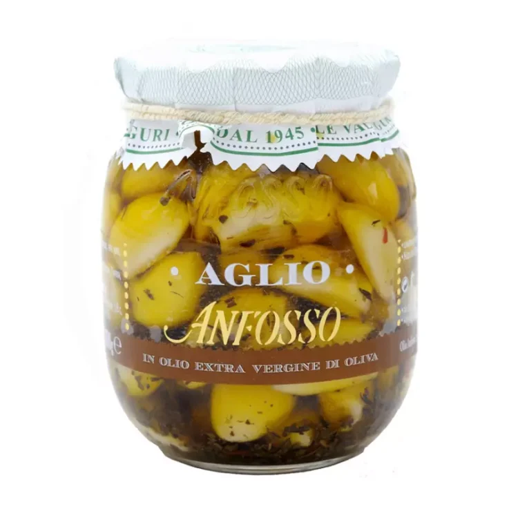 Anfosso garlic cloves in extra virgin olive oil is a product that preserves all the taste and flavor garlic, enriched with spices and aromatic herbs such as marjoram, chilli, black pepper, rosemary, laurel and thyme. Ideal with toasted bread and extra virgin olive oil or used as a base for the preparation of sauces and gravies.