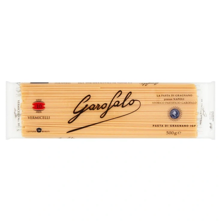 It is often thought that Vermicelli is a thin noodle pasta but in Italy Vermicelli is a long pasta cut that is actually slightly thicker than Spaghetti. Use in place of spaghetti if you want a robust long pasta to soak up a chunky sauce. Garofalo pasta is formed through a bronze die this method allows a little friction on the surface of the pasta, which becomes slightly rough and porous allowing the sauce to cling and be absorbed into the pasta giving a delightful eating experience. Suitable for Vegans & Vegetarians, Kosher.