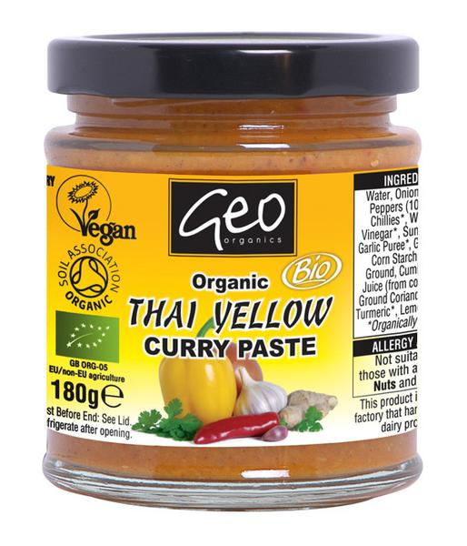 Pâte de cuisson concentrée au curry jaune biologique pour créer un authentique curry thaï de Geo Organics. Sans sucre ajouté ni arômes artificiels.