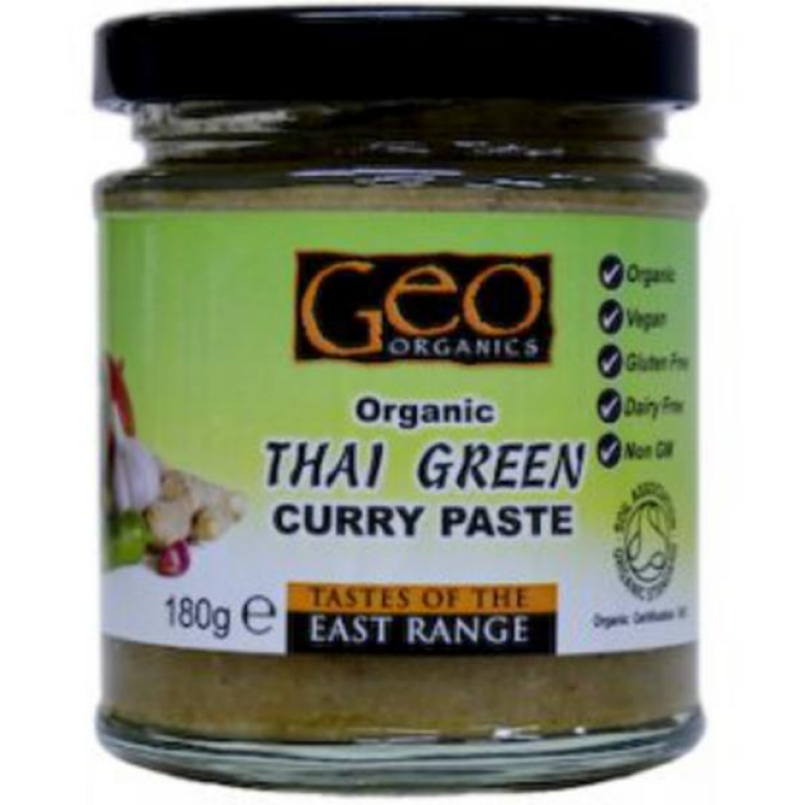 Faites frire votre propre curry vert thia savoureux avec cette pâte de curry vert thaï biologique de Geo Organics. 180g.