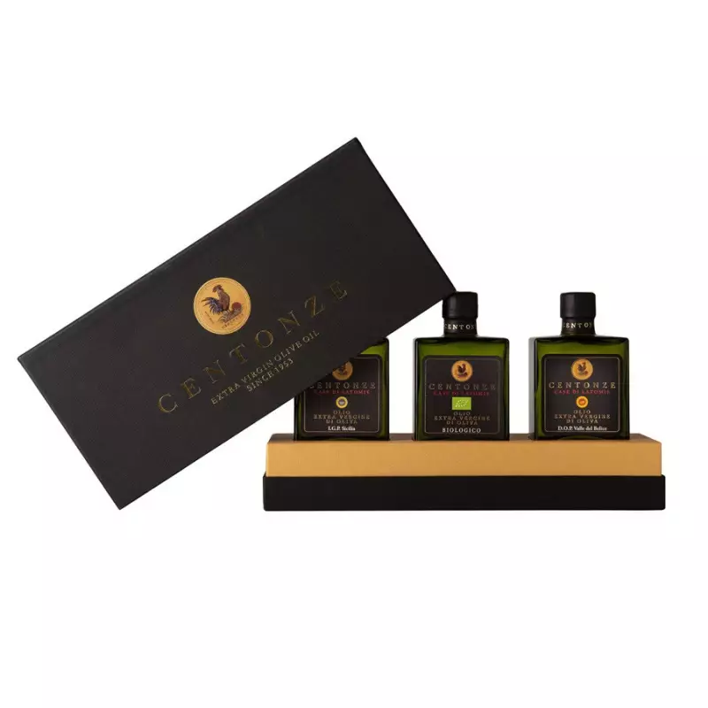 Gift Box Extra Virgin Olive Oil Centonze : Sicilia PGI, Organic Nocellara, PDO Valle del Belice 200 ml x 3