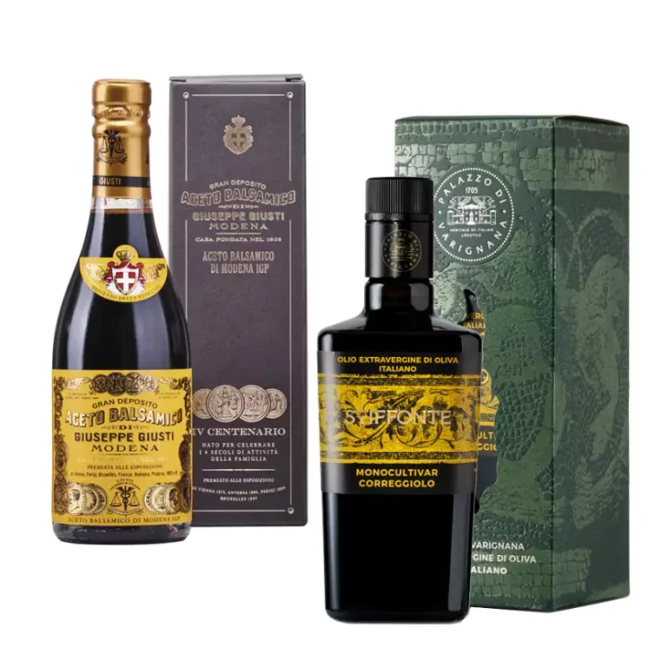 Giusti Balsamic Vinegar of Modena PGI 4 Gold Medals comes together with Extra Virgin Olive Oil Stiffonte by Palazzo di Varignana in this unique fine condiment duo at a very special price. The elegant boxes of the two bottles make it perfect for a special gourmet gift idea for any occasion.