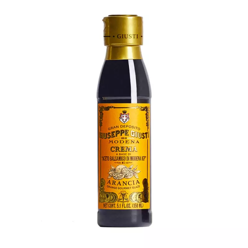 The Cream based on Balsamic Vinegar of Modena PGI flavored with Orange Giuseppe Giusti, has a fresh and citrusy flavor that goes perfectly with the sweet and sour taste of Balsamic Vinegar of Modena PGI. It is a very versatile gourmet condiment thanks to its practicality of use and the balance between the moderate acidity and the unmistakable sweetness of the cooked grape must, which allows you to garnish, finish, create great flavor contrasts in any dish, from appetizer to dessert. The orange vinegar glaze is perfect on salads but especially on desserts, ice cream and fruit salads.