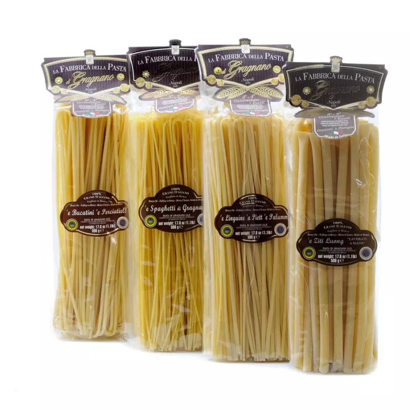 A Set with 4 sizes of Pasta Lunga of the Fabbrica della Pasta, all certified Pasta di Gragnano IGP, synonymous with craftsmanship and Italian quality. Bucatini, Linguine Spaghetti and long Ziti, all produced using only the best semolina of first extraction, combined with the water of the clear spring of Gragnano, and bronze drawing. Complete the extraordinary processing, a long and gentle drying at low temperature. What are you waiting for? Try them all and discover your favorite!