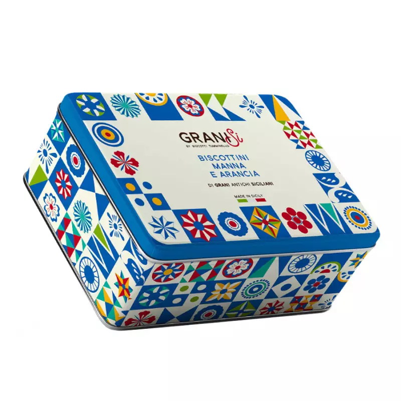 Tumminello Orange and Manna Biscuits are packaged in an elegant metal tin. The modern design of the tins is inspired by Mediterranean colours and atmospheres, with decorations reminiscent of traditional Sicilian majolica, reinterpreted in a contemporary key. This blend of tradition and modernity is intended as a tribute to Sicily, paying homage to its cultural roots but adapting them with a touch of innovation. The predominant colour is a vibrant blue, evocative of Sicilian coastal landscapes, immediately bringing to mind the beauty and richness of the island.