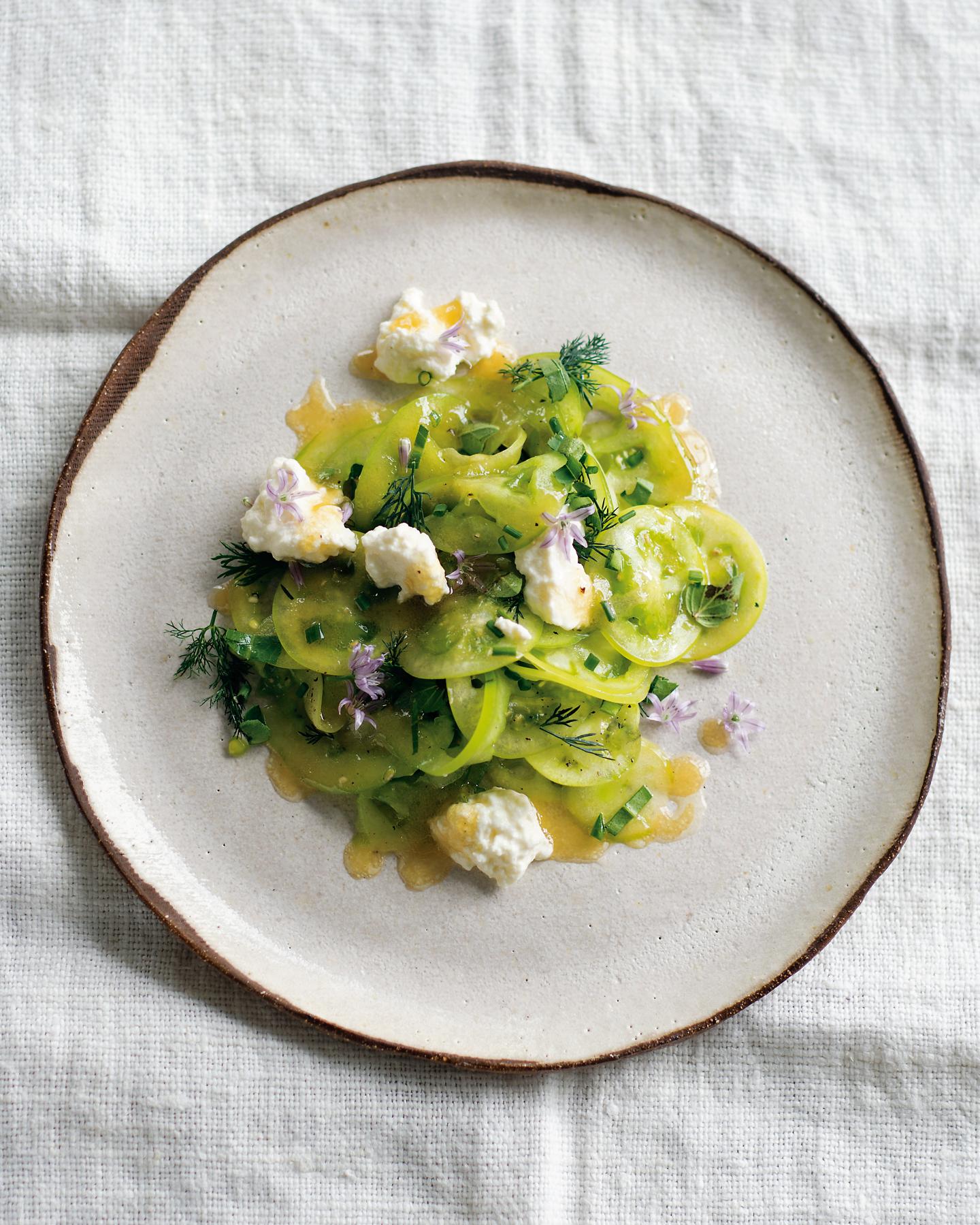 Place the tomatoes on platter, scatter with the rest of the herbs and the chive flowers, if using, and top with small dollops of ricotta.