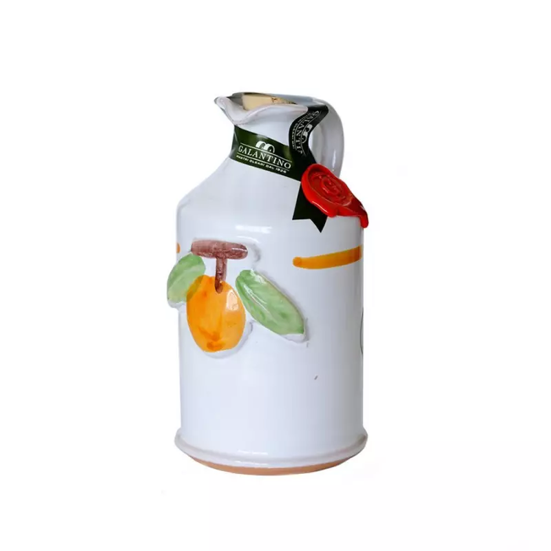 Galantino ceramic jars are hand-made by expert artisans in Puglia. Each piece is unique because it is decorated by hand. Inside the jar there is Galantino Extra Virgin Olive Oil, which, in this special edition of ceramic jars assortment, is flavoured with fruits, herbs and spices. This one in particular, as you can see by the decoration, is flavoured with orange.