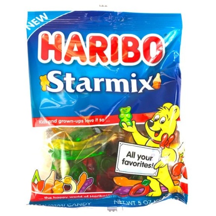 It’s an all-star gathering of Haribo’s best! This bag of gummies gives a mixture of cola bottle gummies, sweet and sour snakes, cherries, rings, and the classic gummy bears to make the ultimate Starmix!