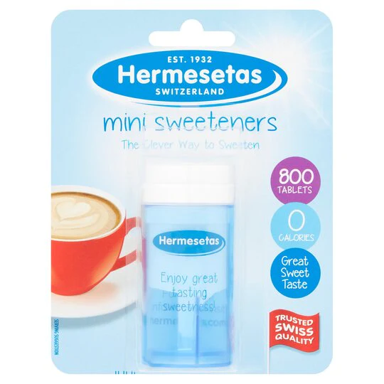 Great tasting and great value premium Swiss quality Hermesetas Sweeteners are trusted and enjoyed as the clever calorie-free way to replace sugar and sweeten food and drinks in over 100 countries worldwide. Calorie-free table top sweetener based on Saccharin.