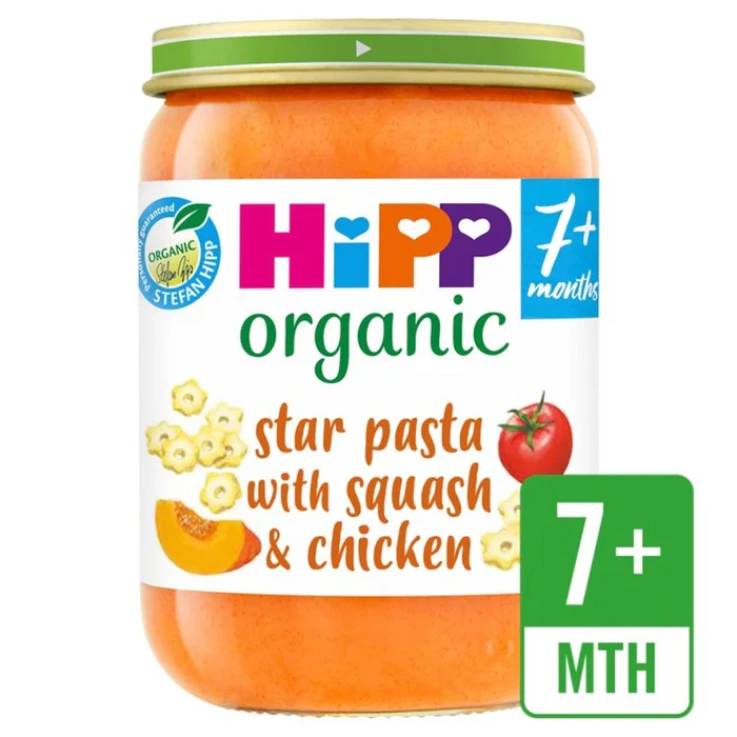 A tasty combination of sweet squash with chicken and star-shaped pasta. Organic baby food, with little lumps to encourage chewing, No added salt, No GM or preservatives – as required by law.