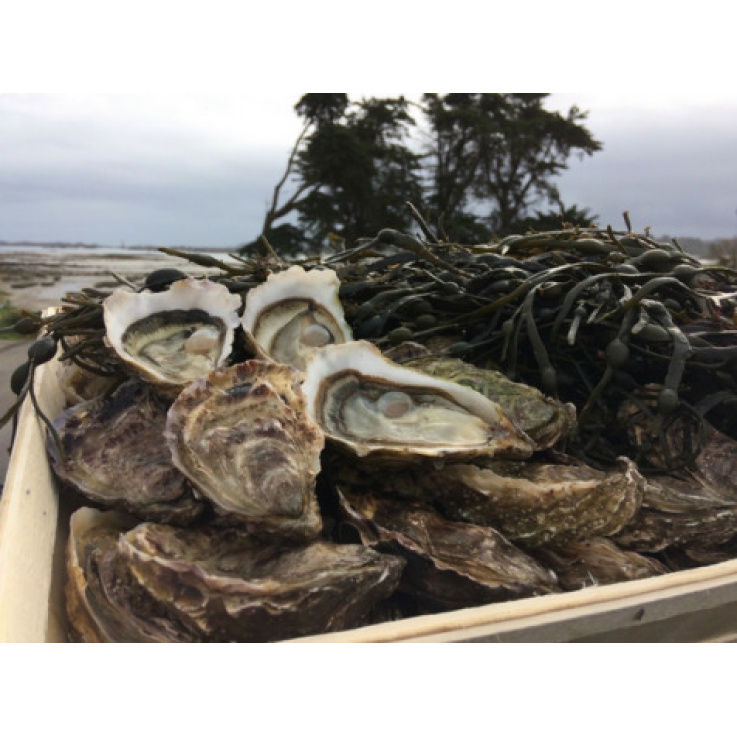 Ces huîtres creuses n°2 mi fines-mi spéciales sont produites du naissain jusqu’à commercialisation exclusivement en Bretagne sur le secteur de Paimpol (1er bassin de production de France). Baignées aux abords de l’île de Saint Riom, elles obtiennent un taux de chair plus important et une longueur en bouche plus prononcées. L’huître n°2 est l’une des plus imposantes, elle pèse entre 85 et 106 grammes. La bourriche contient 36 huîtres pour un poids de 4 kg, ainsi qu’une couche d’algues permettant la conservation et le maintient des mollusques.
