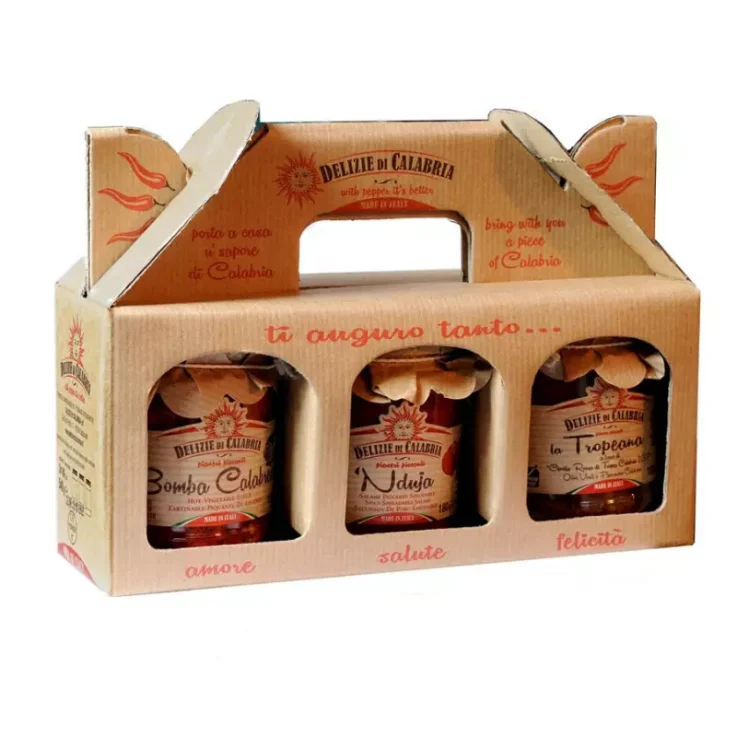 Discover the authentic flavours of Calabria with the ‘I 3 Tesori Salse Tipiche Calabresi’ gift pack from Delizie di Calabria. This special pack contains three of the best-known and most appreciated Calabrian sauces: Bomba Calabrese, ‘Nduja and salsa Tropeana, all in 180 g format and characterised by the unmistakable flavour of Calabrian chilli peppers. Presented in a practical cardboard case, these sauces represent a delicious gift idea to wish for love, health and happiness, always under the banner of good traditional Italian food.
