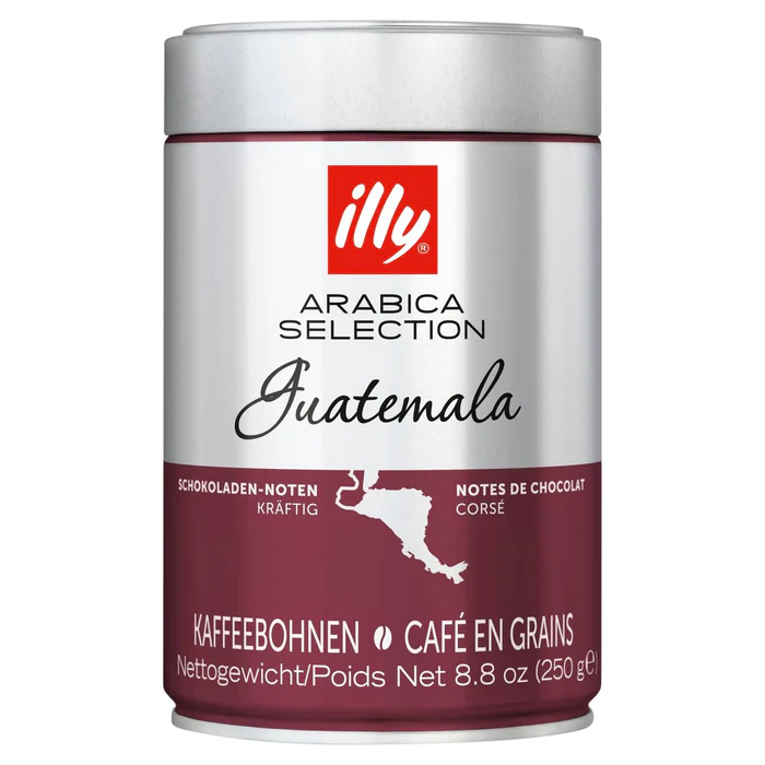 100% Arabica Coffee Beans, Â illy’s unique smooth, rich and full-bodied taste is created by our expert blenders using a dynamic recipe that has been perfected for over 80 years to skilfully combine the top 1% of the finest 9 origins of Arabica, creating our globally renowned signature blend. illy Guatemala Arabica Coffee Selection features a distintictly bitter taste and an intense aroma and body, characterized by notes of chocolate. Â illy coffee beans are as good for the planet as they are flawlessly consistent, smooth and never bitter. Single Origin Guatemala, Pressurized for freshness, 1.5% Caffeine