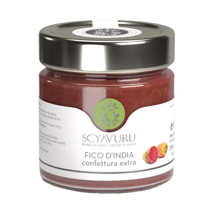 Scyavuru Extra Indian Fig Jam retains all the flavor and aroma of native prickly pears, thanks to a processing method that excludes cooking over a very high flame and thus keeps the fruit’s flavors, colors, scents and nutrients intact. It contains more than 65 percent fruit, for a total of 250 grams of pure and simple goodness, preserving the unmistakable scent of the highly sought-after Sicilian prickly pears. With a strong flavor and sweet taste, this jam is perfect for garnishing desserts but also in combination with fresh and aged cheeses.