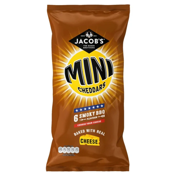 Jacob’s Mini Cheddars are oven baked to perfection with real cheese for a delicious, crunchy snack. Mini Cheddars Smoky BBQ combines the rich cheese with distinct barbeque flavor, for cheese lovers everywhere. Individual 25g bags, perfect for a lunchtime snack. Jacob’s is the number one savory biscuit brand and has been baking its delicious savory snacks, packed with flavor and crunch, since 1851.