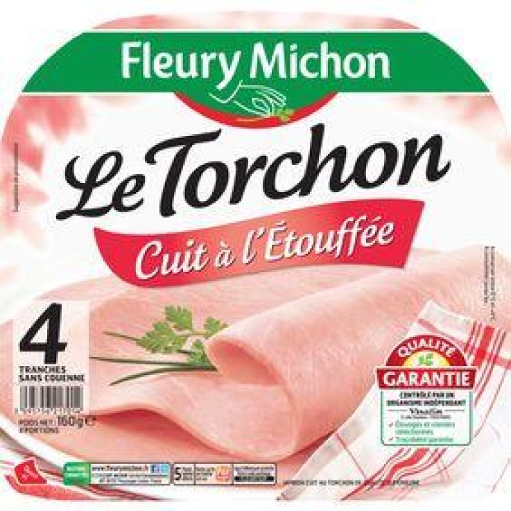 Jambon découenné Le Torchon cuit à l’étouffée VPF FLEURY MICHON, 4 tranches, 160g