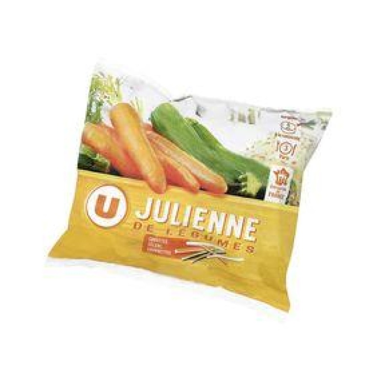 Julienne de légumes surgelés. Carottes 33,4%, CELERIS 33,3%, courgettes 33,3%.