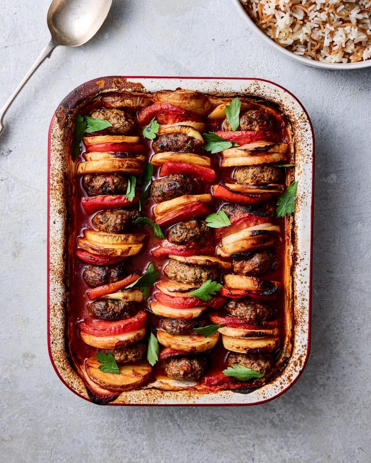 This is a weeknight hero in our house. I know this because every bowl is empty after dinner. It’s full of veg and plenty of flavour, and not only does it make the best leftovers, it freezes really well too. Traditionally, Kafta tray bake is served with Lebanese vermicelli rice.