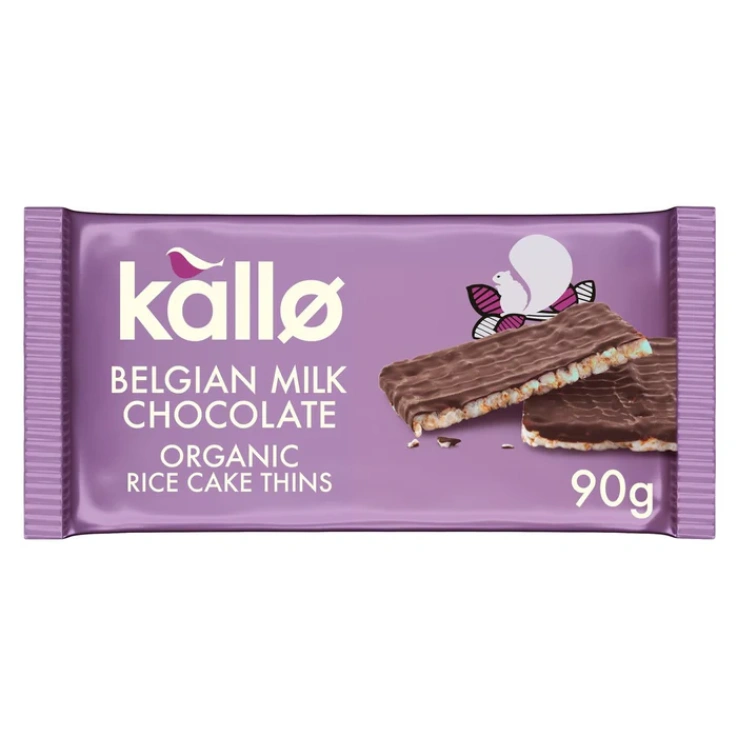 Kallo® Organic Chocolate Rice Cake Thins. Coated with Belgian Milk Chocolate. Organic, Quite the star with a nice cup of cha!, 56 calories per rice cake thin, A source of fibre, Made with Belgian chocolate, Gluten free, No artificial colours, flavours or preservatives, Vegetarian friendly