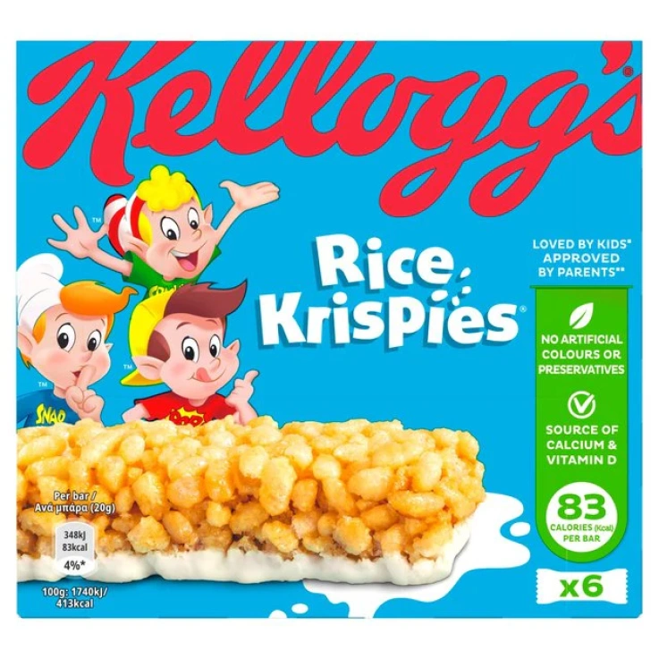 the great taste of Rice Krispies in handy cereal bar form, Contains 6 bars, 20 grams each, Great for kids and the rest of the family, Enjoy as a mid-morning nibble, lunchtime treat or on the go snack, Each bar is a source of important nutrients, including calcium and vitamin D, 83 calories (kcal) per bar, Source of calcium, Source of vitamin D, No artificial colours or preservatives, Suitable for vegetarians, Halal – HFA approved
