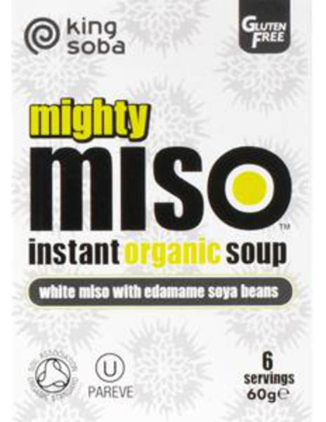 La soupe miso instantanĂ©e King Soba contient 6 sachets de 10 g de miso blanc, avec des haricots edamame et des algues wakame ajoutĂ©s. Il peut ĂŞtre bu directement dans une tasse, bien qu’il puisse ĂŞtre transformĂ© en une collation plus substantielle en le prĂ©parant dans un bol et en ajoutant des lĂ©gumes et des nouilles, ou en le mangeant avec du pain croustillant. Tous les ingrĂ©dients biologiques. Recette sans gluten.