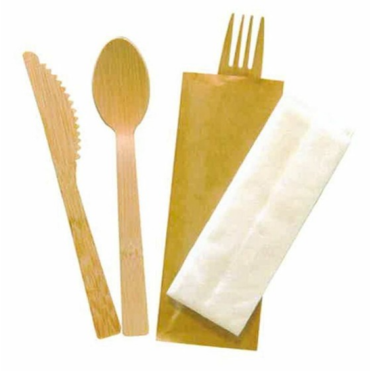 Ce kit couvert contient un couteau, une fourchette, une petite cuillère en bambou et une serviette en papier. Ce 4 en 1 est très pratique et permet de préparer rapidement vos mises en place ainsi que vos préparations de commande à emporter. Ce kit couvert bambou est très apprécié des métiers de la restauration rapide et de la vente à emporter.