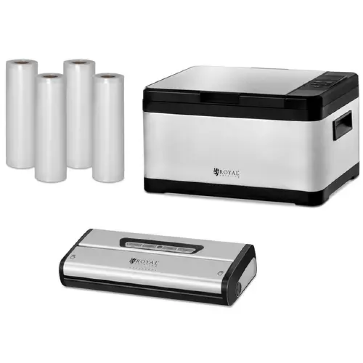 Depuis toujours vous avez rêvé de laisser mijoter doucement vos aliments emballés sous vide ? Alors décidez-vous aujourd’hui encore pour le kit de cuisson sous-vide RCSV-SET1 conçu par les professionnels de la restauration Royal Catering ! Il est composé d’un cuiseur sous-vide, d’une machine à emballages sous vide et de quatre rouleaux d’emballages sous vide adaptés. Le kit complet est pensé pour un usage professionnel dans l’hôtellerie, les restaurants ou pour les services de restauration collective, mais également pour cuisiner et mettre sous vide à la maison.