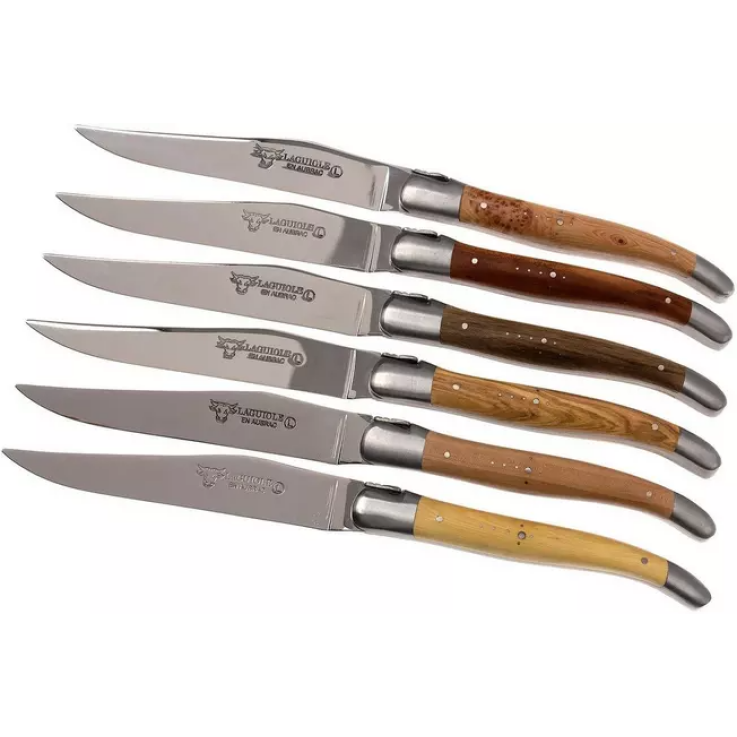 Le**Ensemble de 6 couteaux à steak Laguiole et Aubrac bois français ::**offre un enrichissement pour chaque table à manger. Si vous recherchez des couteaux à steak français faits à la main, Laguiole en Aubrac a ce qu’il vous faut. Cette marque authentique de Laguiole produit depuis des années des couteaux de grande qualité. La lame de ces couteaux de table est fabriquée à partir d’un acier inoxydable de type couteau. Cela continue dans un manche en bois. Chaque couteau à steak a un type de bois différent incorporé dans le manche. Le bois de noyer, le bois d’olivier, le bois de prunier, le bois de palmier, le bois de genévrier et le bois de pommier se retrouvent sur les poignées