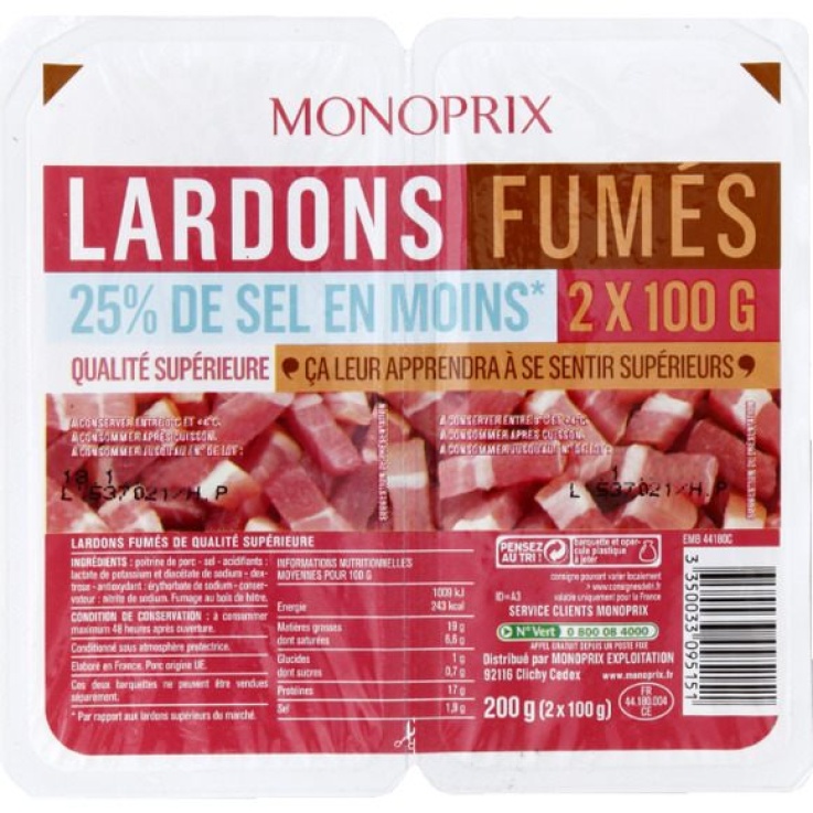 Lardons fumés, 25% de sel en moins qualité supérieure