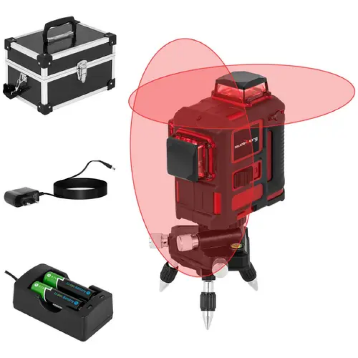 Le niveau laser dispose de l’indice de protection IP54, ce qui signifie qu’il est protĂ©gĂ© contre les poussières et rĂ©sidus microscopiques, ainsi que contre les projections d’eau de toutes directions. Son boĂ®tier se compose de plastique et d’acier, ce qui lui assure une durĂ©e de vie Ă©levĂ©e. Outre un laser rotatif, la livraison comprend une mallette en aluminium dans laquelle l’instrument de mesure et tous ses accessoires peuvent Ăªtre rangĂ©s en toute sĂ©curitĂ©. Une batterie au lithium et un chargeur se trouvent Ă©galement dans l’envoi. ÉquipĂ© de cette batterie, le laser en croix jouit d’une autonomie de jusqu’à 8 h.