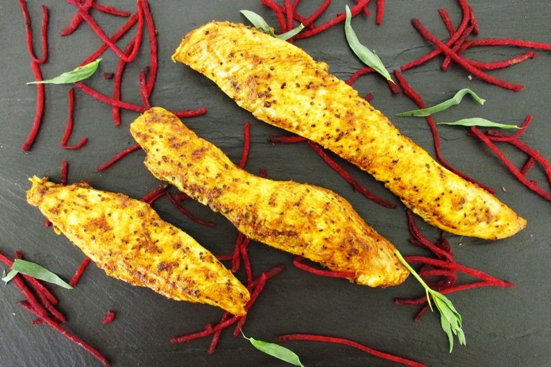 Fines tranches de filet de poulet marinées