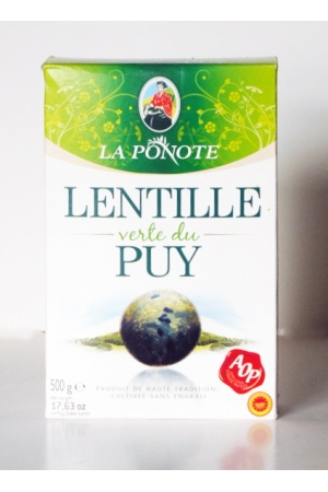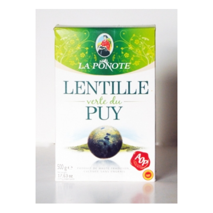 • Ingrédients : Lentilles vertes du Puy A.O.P. Valeur énergétiques et nutritionnelles moyennes pour 100g: Energie: 1 435 kJ/343 kcal Matières grasses 1,06g dont acides gras saturés 0,16g. Glucides 29,58g dont sucres 2,03g Fibres alimentaires: 30,5g Protéines: 25,8g Sel: 0,02g