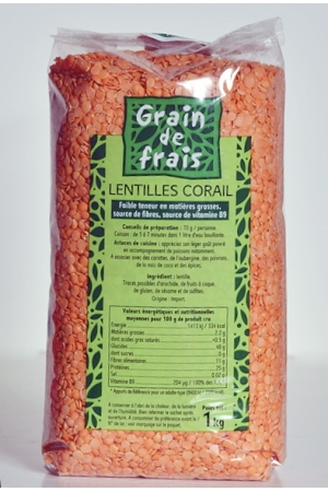 • Marque : Grain de Frais • Origine : Import • Conditionnement : Sachet 1kg • Ingrédients : Lentille. Traces possibles d’arachide, de fruits à coque, de gluten , de sésame et de sulfites.