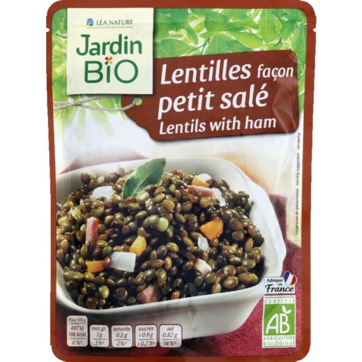 Un délicieux mélange de lentilles vertes accompagnées de petits oignons, de carottes, d’aromates et de morceaux de jambon, à savourer selon vos envies, en plat principal ou en accompagnement. Parce que votre temps est précieux et que votre alimentation l’est aussi, Jardin Bio vous propose une gamme de recettes bio originales et savoureuses prêtes en quelques minutes.
