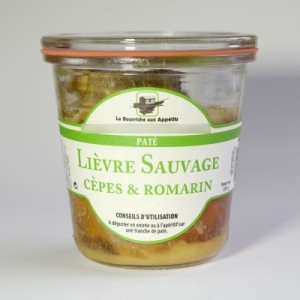 INGREDIENTS: Lièvre sauvage (40%), gorge de porc*, poitrine de porc*, foie de poule*t, vin rouge (sulfites), oeuf, cèpes (4%), romarin (0,5%), échalote, madère (sulfites), sel, fécule de pomme de terre, protéines de lait, gélatine, poivre, laurier, thym.