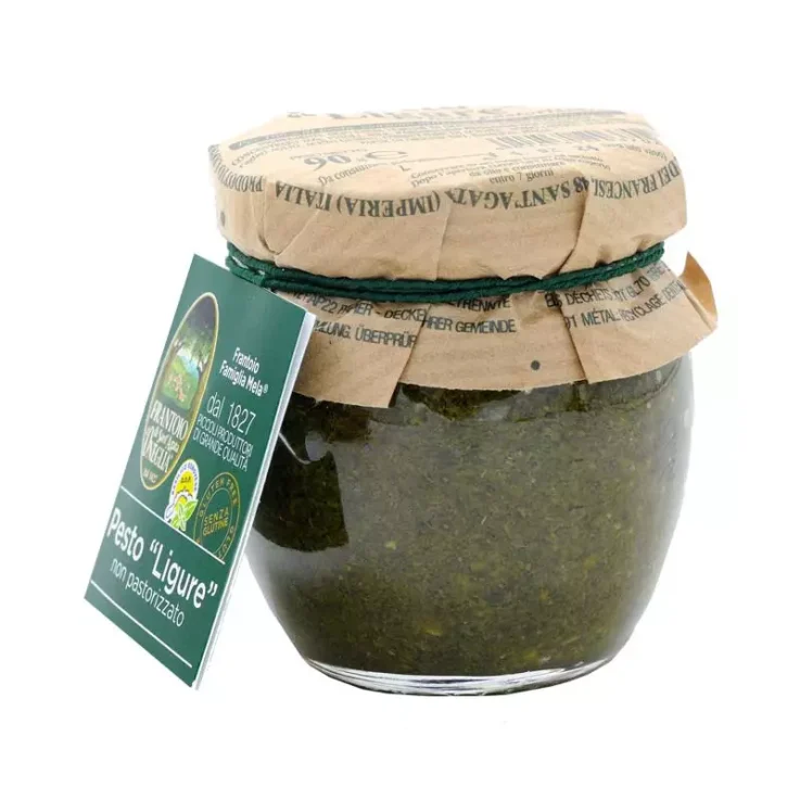 The Green Pesto sauce with garlic from Frantoio Sant’Agata d’Oneglia is produced only with the best traditional Ligurian ingredients such as PDO Genoese Basil, Extra Virgin Olive Oil, fine pine nuts and PDO Parmigiano Reggiano aged for 30 months. The Ligurian Pesto from Frantoio Sant’Agata is not pasteurized and therefore it retains all the aroma and taste of authentic Genoese pesto, together with the freshness of flavors and the characteristic bright green color. As this pesto is very tasty, we recommend not salting the cooking water of pasta and diluting pesto with a couple of tablespoons of the same cooking water before use.