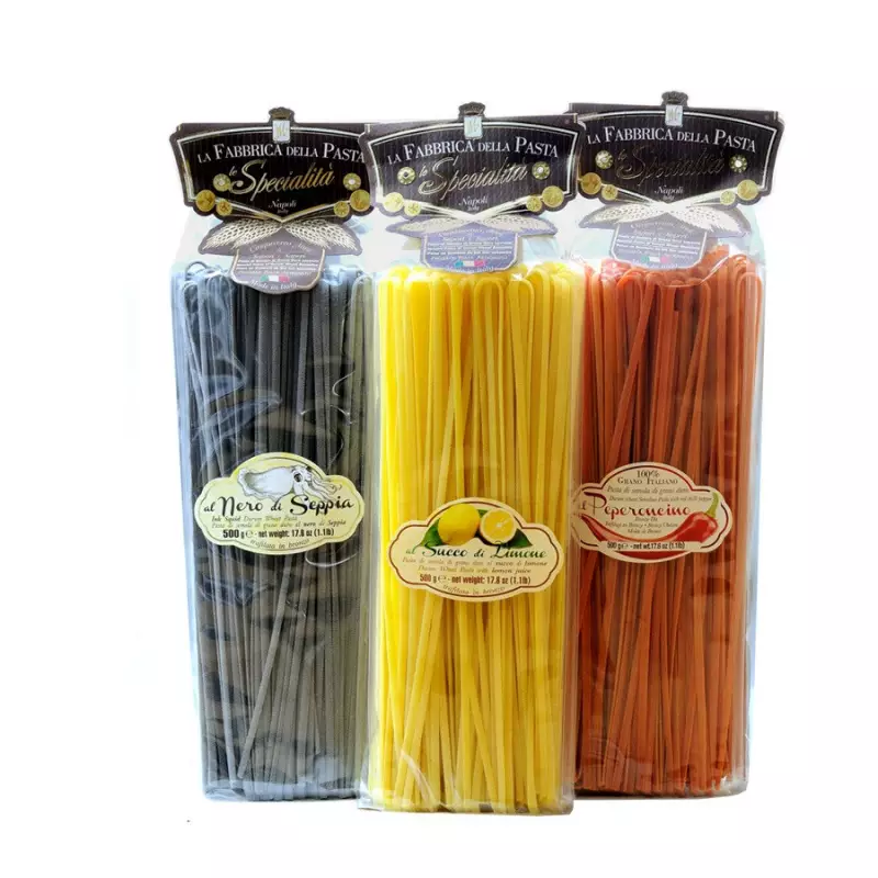 With the Tris of flavored Linguine Fabbrica della Pasta we have combined three different flavors in one promotion: Linguine with Peperoncino, Lemon and Squid Ink. The high quality of Gragnano pasta in three different variations, for a first course always different!