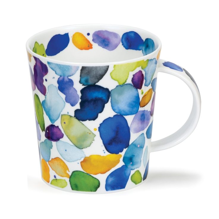 Developing from the popular Hot Spots design, Blobs is a modern watercolour by Caroline Bessey consisting of random, brilliantly coloured shapes. This mug in the Blobs range is predominantly blue with purple, yellow and green