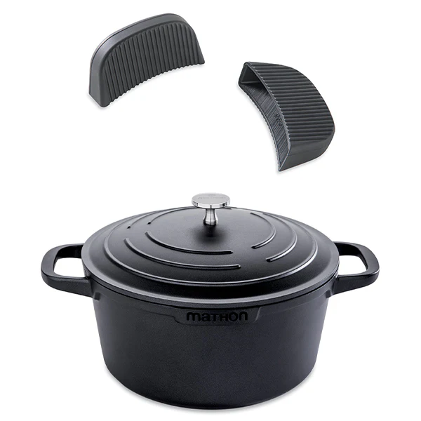 Lot cocotte légère ronde en fonte d’aluminium 24 cm et deux maniques en silicone Mathon